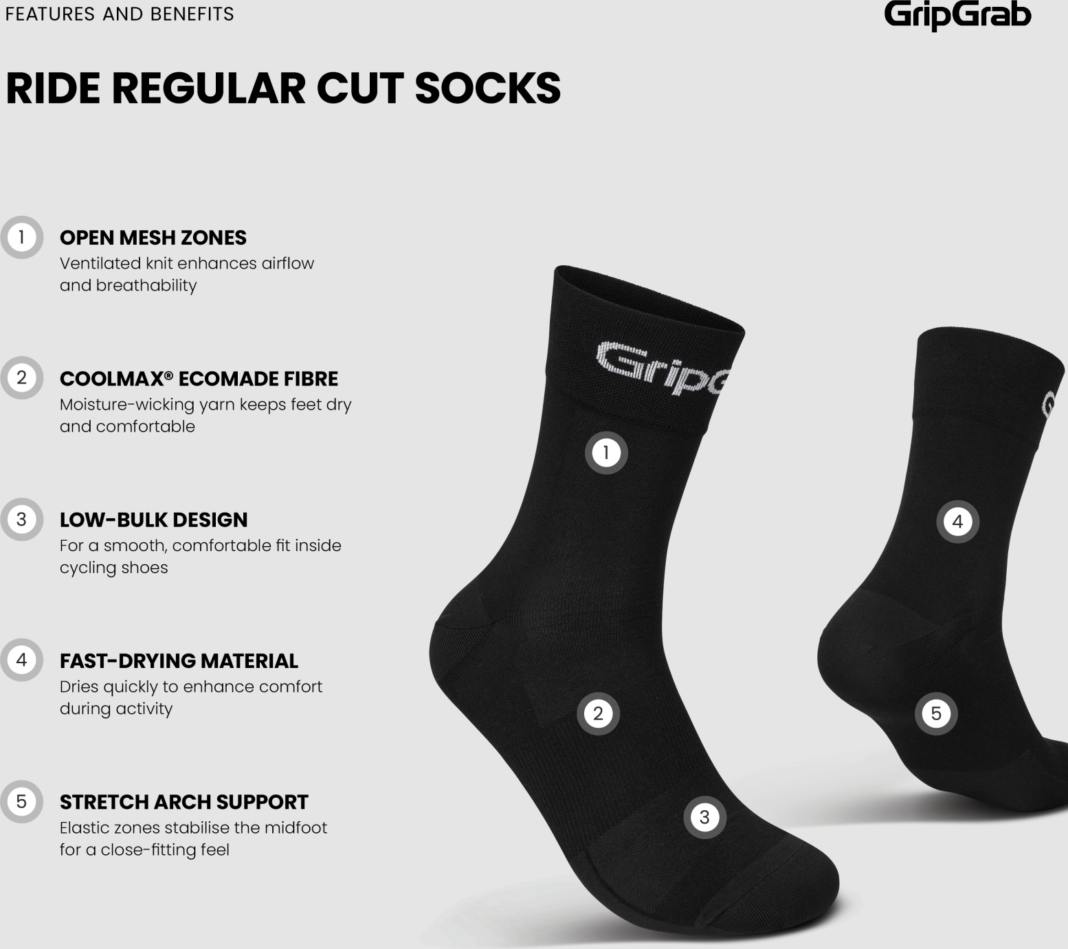 Die GripGrab RIDE Regular Cut Socken sind leichte Radsocken für Fahrten bei warmem Wetter – entwickelt für Atmungsaktivität, Feuchtigkeitsmanagement und zuverlässigen Komfort im Alltag.