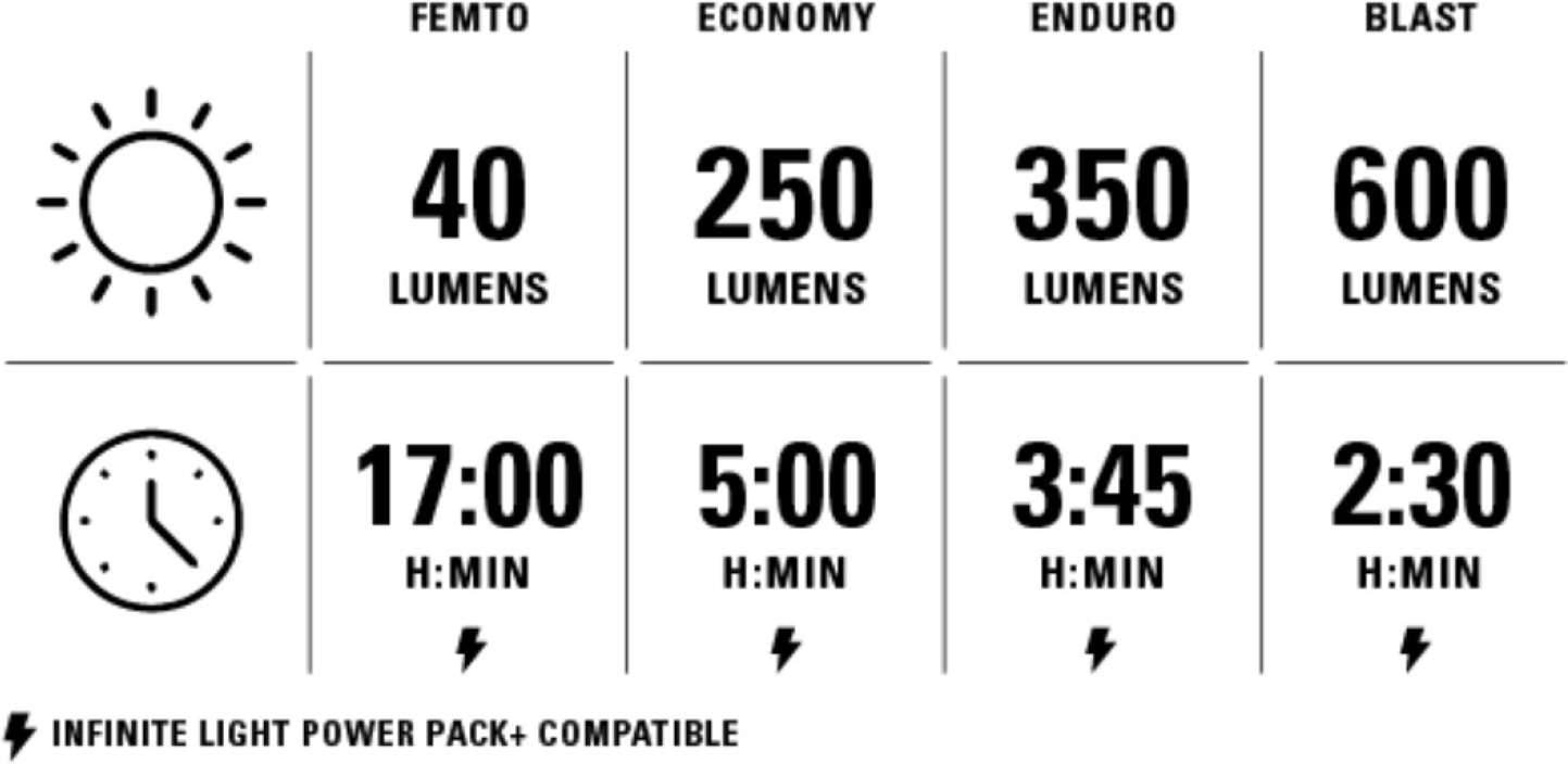 | Enduro Modus: | 350/03:45 Lumen / hh:mm |