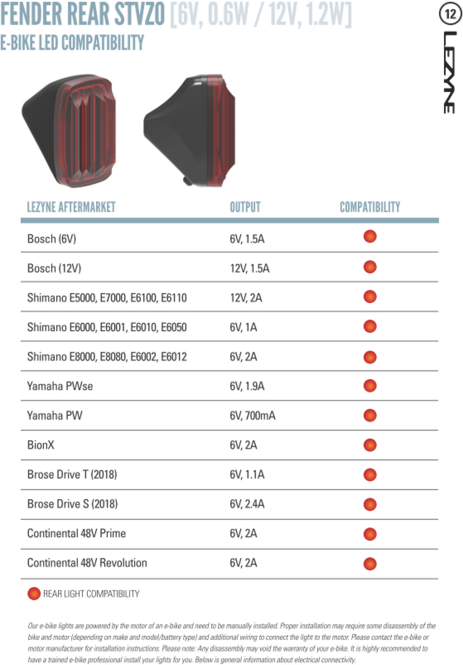 - E-bike compatible 6 - 12v input, 1.2w