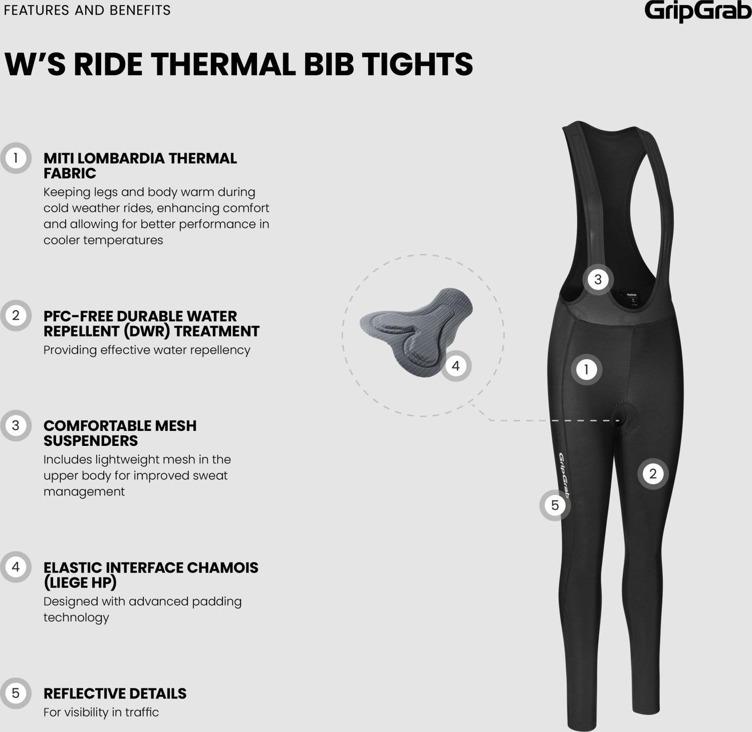 A PFC-free durable water repellent (DWR) treatment offers protection against light rain and road spray. Lightweight mesh suspenders improve breathability, while the Elastic Interface chamois (LIEGE HP) delivers advanced padding for long-ride comfort.